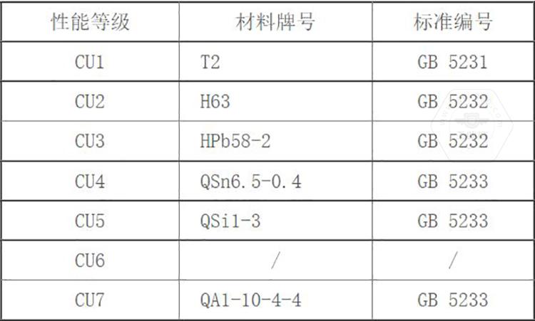 GB/T 3098.10標(biāo)準(zhǔn)中將銅制緊固件分為7個性能等級,標(biāo)記代號由字母及數(shù)字兩部分組成,即有色金屬化學(xué)元素字母加數(shù)字。其性能等級為CU1、CU2、CU3、CU4、CU5、CU6、CU7。標(biāo)準(zhǔn)中同時推薦了對應(yīng)性能等級選用的銅材料牌號。
