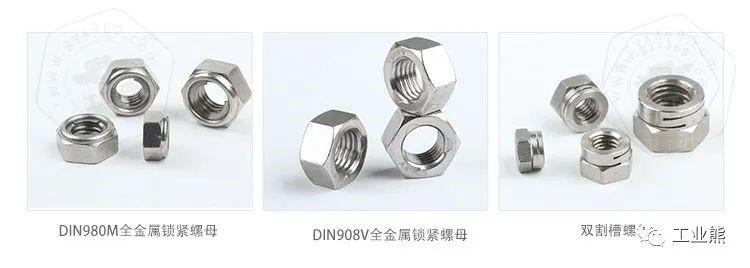 鎖緊螺母分為全金屬系列鎖緊螺母或者非金屬嵌件系列鎖緊螺母等。全金屬系列鎖緊螺母,一般會利用螺母變形防松的型式,一般通過割槽的型式,或者擠壓螺紋變形的型式,例如法標(biāo)的雙割槽螺母,以及DIN980V鎖緊螺母,或者采用螺母頂部加裝金屬簧片的型式,起到鎖緊的作用,例如DIN980M鎖緊螺母。